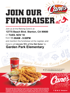 Join our fundraiser at Cane's Tuesday November 18th 11:00 A.M. To 9:00 P.M. . Mention the fundraiser and Cane's will donate 15% of net sales to Garden Park MORE INFORMATION