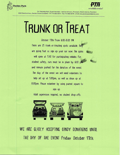 Garden Park Trunk-or-Treat is on October 17th from 6:00-8:00 P.M.